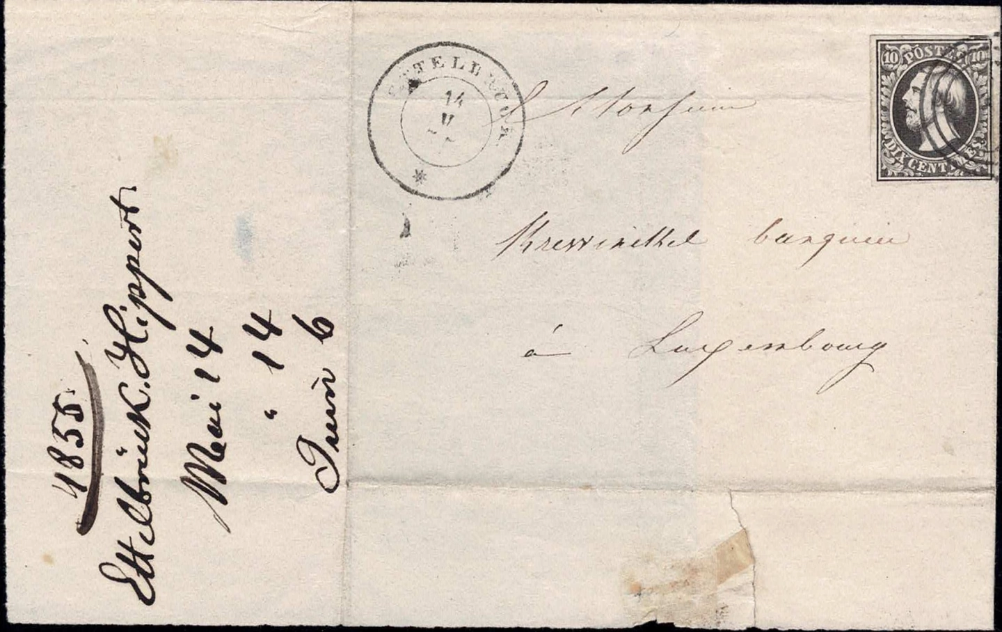 1858 Lettre Ettelbruck vers Luxembourg Timbre Guillaume III. Noir foncé Cachet 3 Cercles